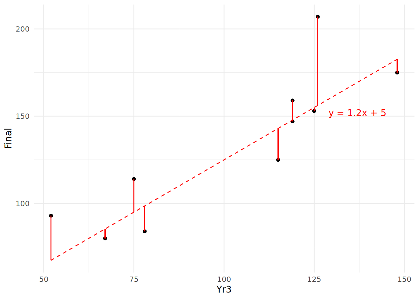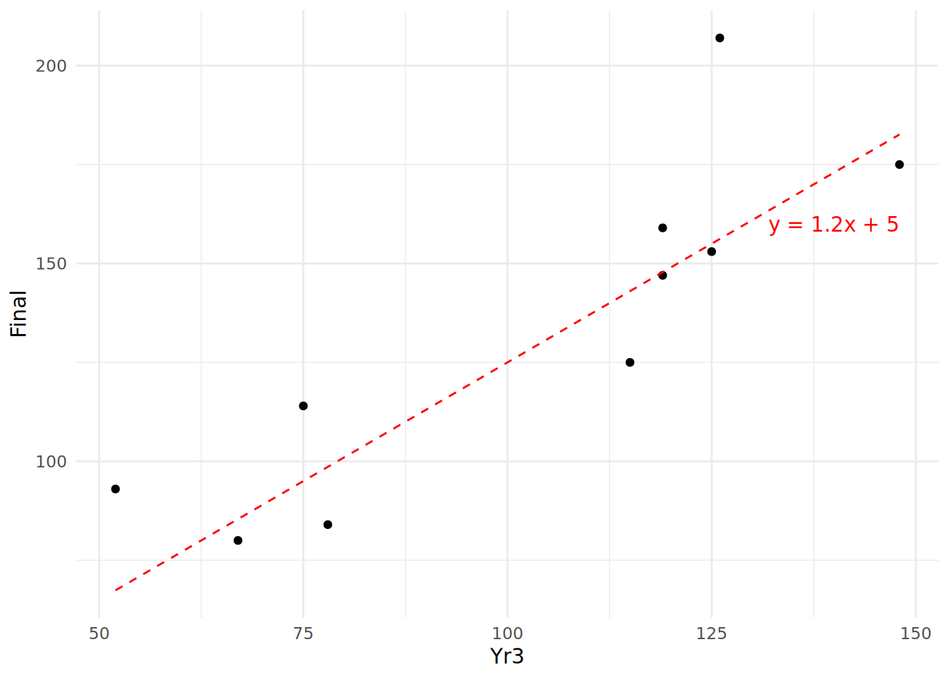 \] Now let’s assume that we have a sample of 10 observations with which to estimate our linear relationship. Let’s take the first 10 values of Yr3 and Final in our ugtests data set: