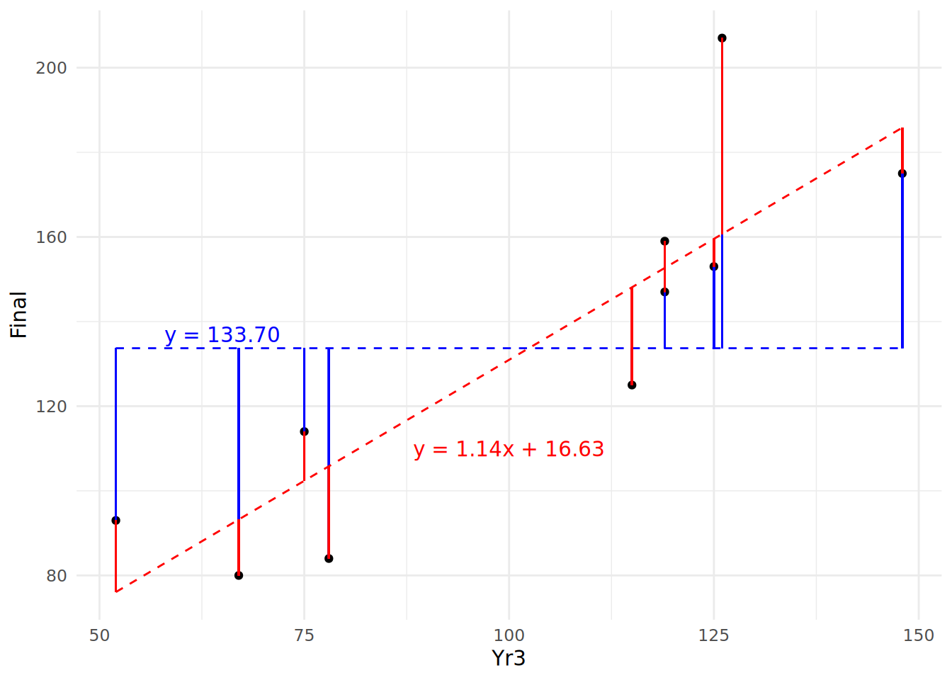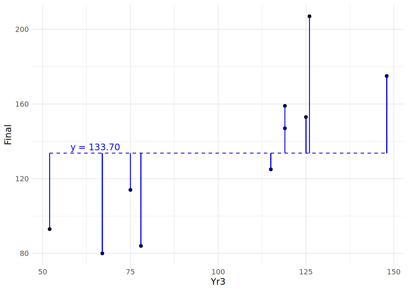 One natural way to benchmark how good a job your model does of explaining the outcome is to compare it to a situation where you have no input and no model at all. In this situation, all you have is your outcome values, which can be considered a random variable with a mean and a variance. In the case of our 10 observations, we have 10 values of Final with a mean of 133.7. We can consider the horizontal line representing the mean of \(y\) as our ‘random model’, and we can calculate the residuals around the mean. This can be seen in Figure 4.6.