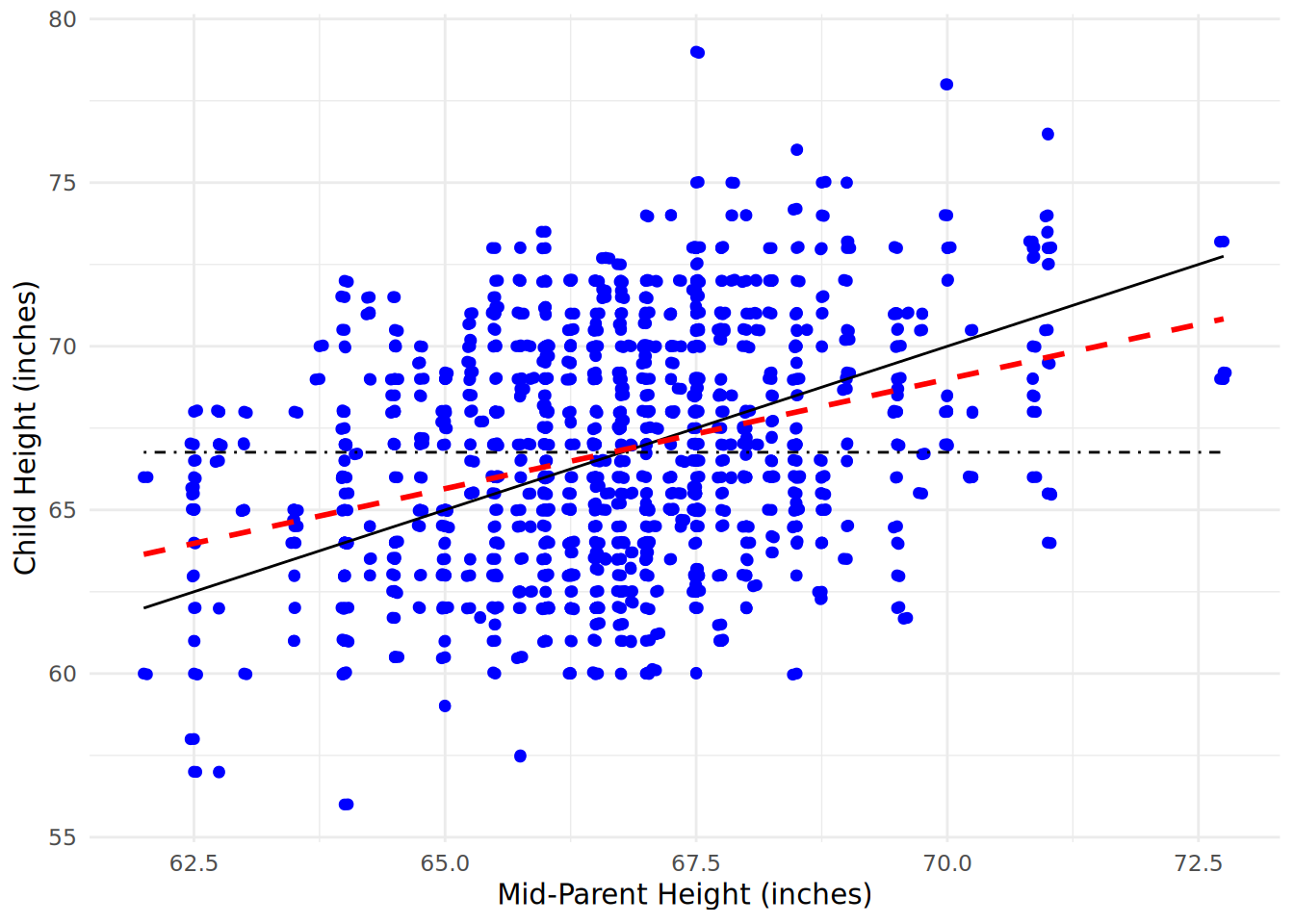 Figure 4.1 is a scatter plot of Galton’s data with the black solid line showing what a perfect relationship would look like, the black dot-dashed line indicating the mean child height and the red dashed line showing the actual relationship determined by Galton1. You can regard the red dashed line as ‘going back’ from the perfect relationship (symbolized by the black line). This might give you an intuition that will help you understand later sections of this chapter. In an arbitrary data set, the red dashed line can lie anywhere between the black dot-dashed line (no relationship) and the black solid line (a perfect relationship). Linear regression is about finding the red dashed line in your data and using it to explain the degree to which your input data (the \(x\) axis) explains your outcome data (the \(y\) axis).