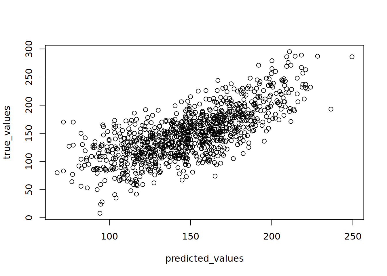 As a side note, in a simple regression model like this, where there is only one input variable, we have the simple identity \(R^2 = r^2\), where \(r\) is the correlation between the input and outcome (for our small set of 10 observations here, the correlation is 0.864).↩︎