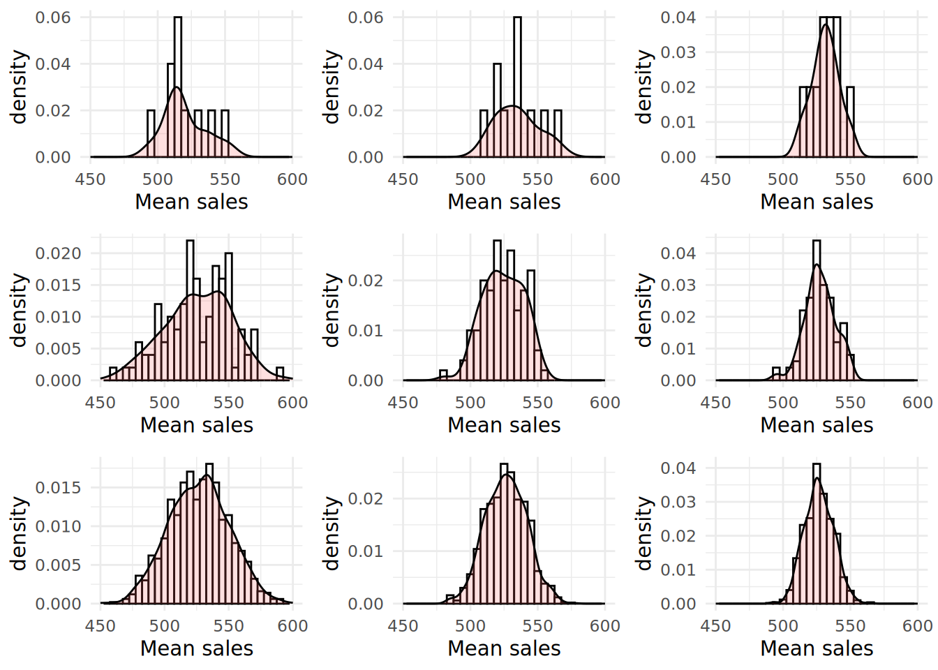Under the central limit theorem, if we take samples from a random variable and calculate a summary statistic for each sample, that statistic is itself a random variable, and its mean converges to the true population statistic with more and more sampling. Let’s test this with a little experiment on our salespeople data. Figure 3.1 shows the results of taking 10, 100 and 1000 different random samples of 50, 100 and 150 salespeople from the salespeople data set and creating a histogram of the resulting mean sales values. We can see how greater numbers of samples (down the rows) lead to a more normal frequency distribution curve and larger sample sizes (across the columns) lead to a ‘spikier’ frequency distribution with a smaller standard deviation.